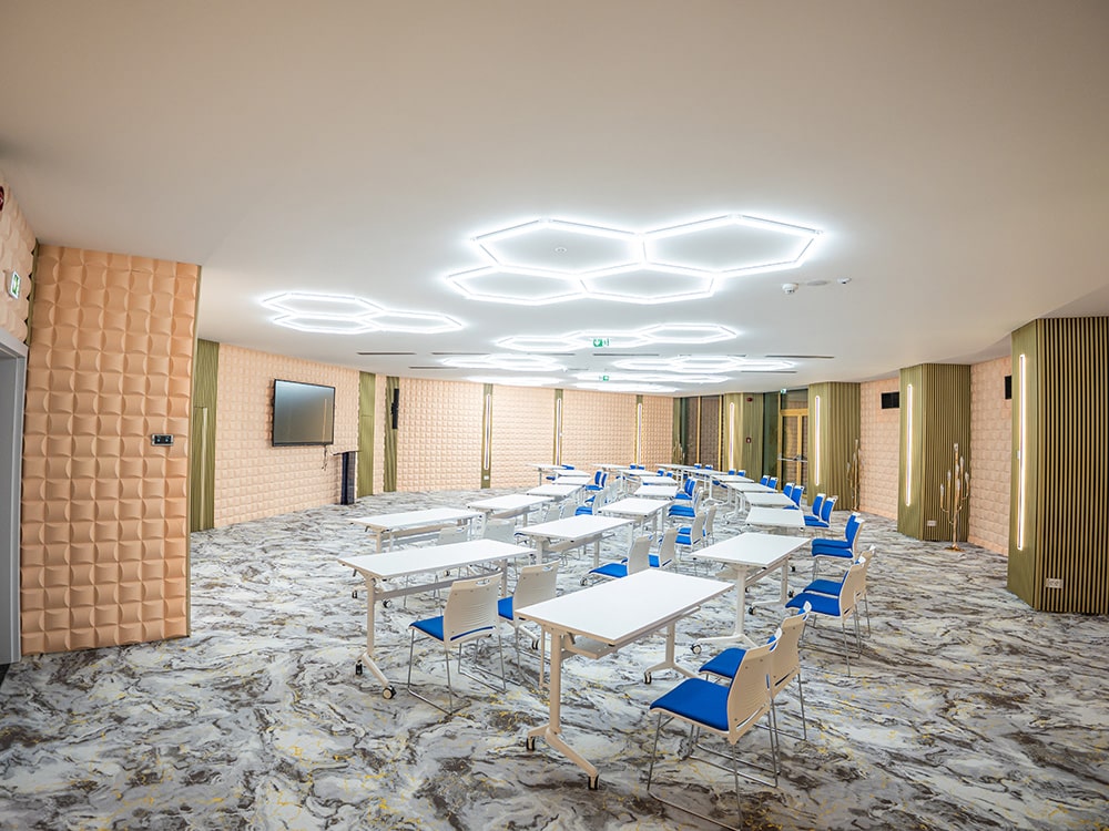 O sală potrivită pentru prezentări, workshopuri, mese private, conferințe restrânse, teambuilding și corporate gala dinner, amenajată elegant și echipată cu facilități moderne.