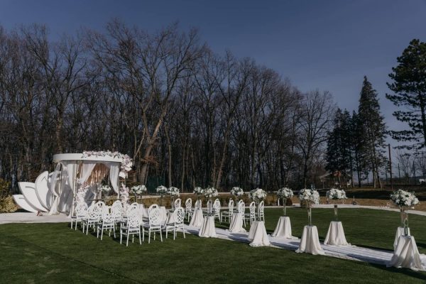 - Zonă de ceremonii amenajată cu scaune albe, covor alb, consolă albă, cilindri aurii cu flori artificiale